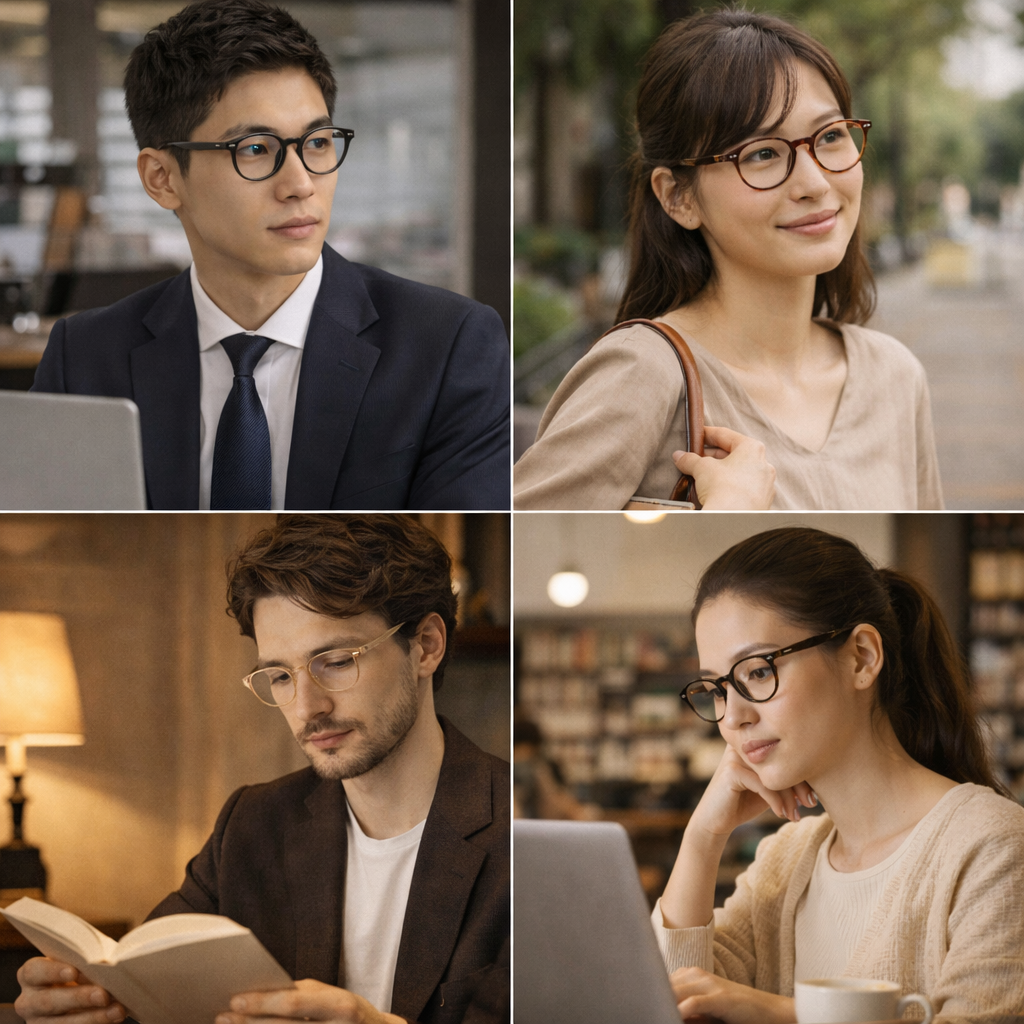 視線がフレームに集中しすぎないため、表情が自然に見え、メガネ初心者でも抵抗感なく着用できます。