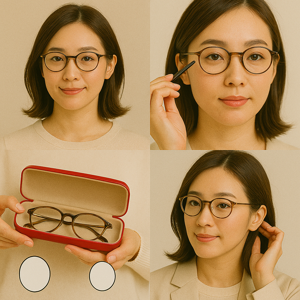 レンズの汚れやフレームのくすみは老けた印象を与えやすいため、日々のお手入れが欠かせません。