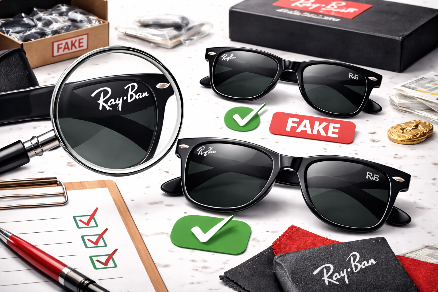 ラグジュアリーアイウェアブランド・イメージ レイバンのサングラスは世界的に人気が高い一方で、その知名度の高さゆえに偽物も多く出回っています。 中でもロゴ部分は本物と偽物の違いが表れやすいポイントとして知られていますが、近年はロゴの再現度が非常に高い精巧な偽物も増えており、見た目だけで判断するのは簡単ではありません。 特にオンライン購入や中古品の場合、写真や第一印象だけでは見抜けないケースも少なくなっています。 そのため、ロゴの違いを正しく理解するだけでなく、本体の細部や付属品の内容、さらには購入先の信頼性 ...